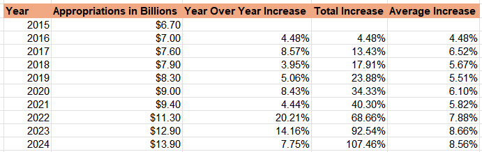 Appropriations have increased tremendously over the past ten years. The Covid era saw huge inflows of federal funds which padded the budget by double digit percentages in fiscal years 2022 and 2023. Appropriations more than doubled over the last ten years, and increased by 67% since Gov. Brad Little’s inauguration.