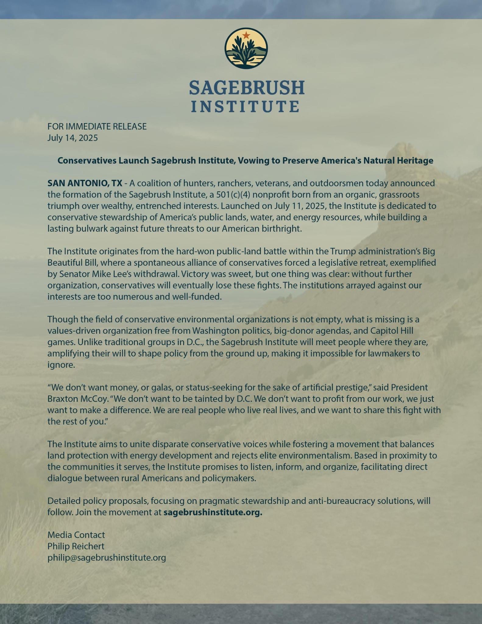 In early July, Braxton McCoy announced the formation of the Sagebrush Institute, dedicated to the conservation of America’s natural resources from a conservative perspective.