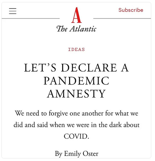 This morning, a journalist named Emily Oster published a piece in the Atlantic titled Let’s Declare a Pandemic Amnesty. Oster’s subtitle says, “We need to forgive one another for what we did and said when we were in the dark about COVID.”