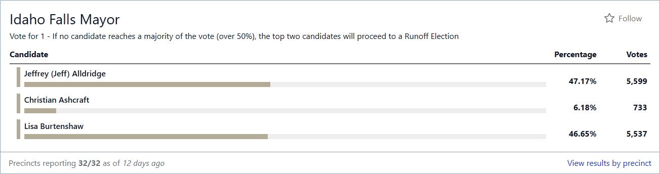 When the votes were counted, Alldridge led with 47.17%, Burtenshaw followed with 46.65%, and Ashcraft took 6.18%, which was just enough to force a runoff between the top two.