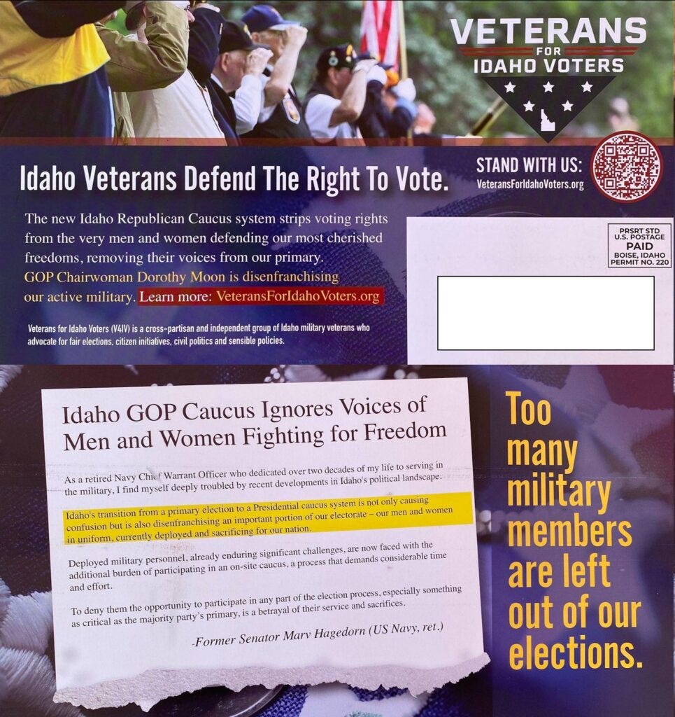Late last week, several Republican voters received a mailer attacking the Idaho Republican Party and Chairwoman Dorothy Moon. It accused Moon of disenfranchising active duty military by not giving them a way to vote in the upcoming presidential caucus.