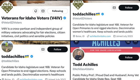 Achilles himself seems to be having trouble figuring out which Twitter account is his. He recently renamed vets4IDvoters from “Veterans for Idaho Voters” to “Todd Achilles” and appeared to be using it for his campaign. After I and several others tweeted about it, he restored the original name and appears to have set up a new account, Achilles4Idaho. He also has another account, toddachilles, since 2012. So who knows what’s going on.