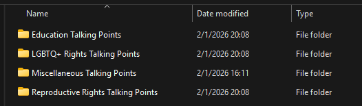 The packet also includes extensive talking points for people testifying on a variety of issues: