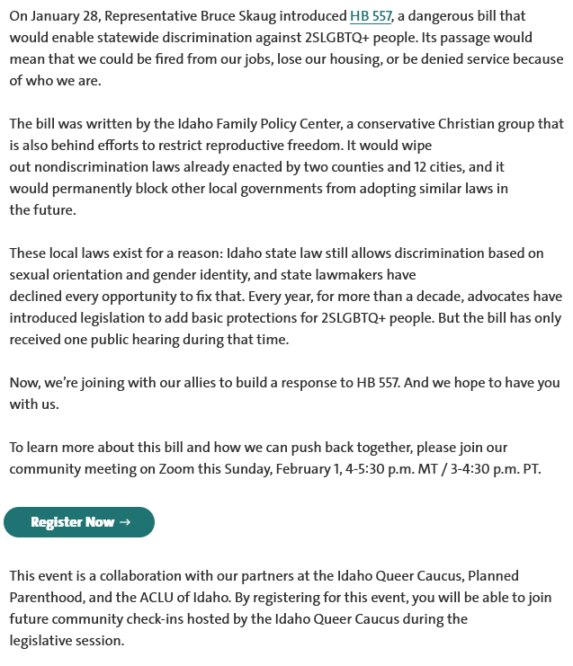 The far left in Idaho is up in arms about this bill. On Sunday afternoon, a group of activists held an online planning meeting to prepare their strategy for testifying against the bill. It was sponsored by LegalVoice, Idaho Queer Caucus, Planned Parenthood, and the ACLU of Idaho.