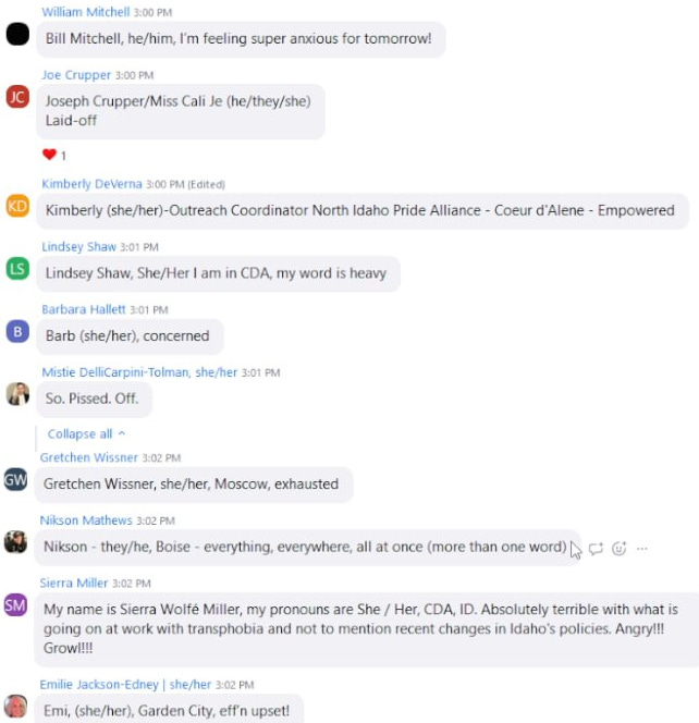Participants in Sunday’s call included Nikson Mathews, a transgender-identifying individual who is a candidate for the House in Boise, as well as Mistie DelliCarpini-Tolman, lobbyist for Planned Parenthood Alliance Advocates; Legal Voice’s Bill Mitchell; and others in the LGBTQ+ space.