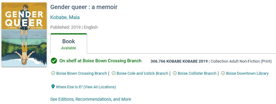 Maybe right now you’re thinking that this is a good thing, because books like this have dangerous ideas. Isn’t that the very argument made by groups such as the ALA for their so-called banned books? Yet the most challenged book of 2023, Gender Queer, is available on Amazon starting at $21.57 for paperback and $12.99 for Kindle. It is also available through the Lynx Library Consortium, and is as of this writing on the shelf at the Bown Crossing Branch of the Boise Library.