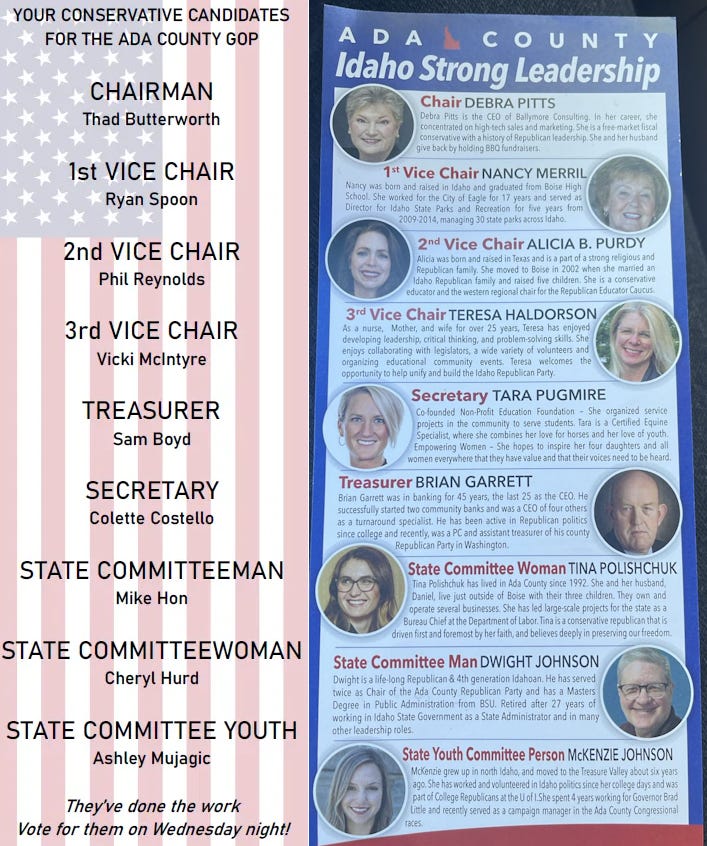The final three positions are perhaps the most important, since they determine who sits on the Idaho GOP State Central Committee. All three incumbents — Mike Hon, Cheryl Hurd, and Ashley Mujagic — were running for reelection, challenged by Dwight Johnson, Tina Polishchuk, and McKenzie Johnson, respectively.