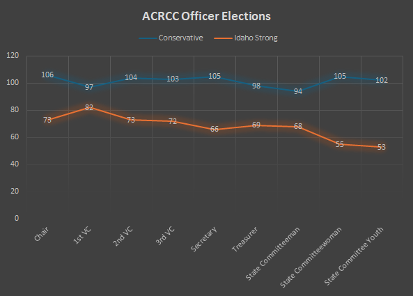 At the Andrus Park pizza party, Travis Clyde told Idaho Strong PCs to stay until the very end, and many did. However, it’s clear that some began leaving as their candidates started losing each election. The Idaho Strong slate peaked with 82 votes for Nancy Merrill, but by the end of the night was in the mid 50s.