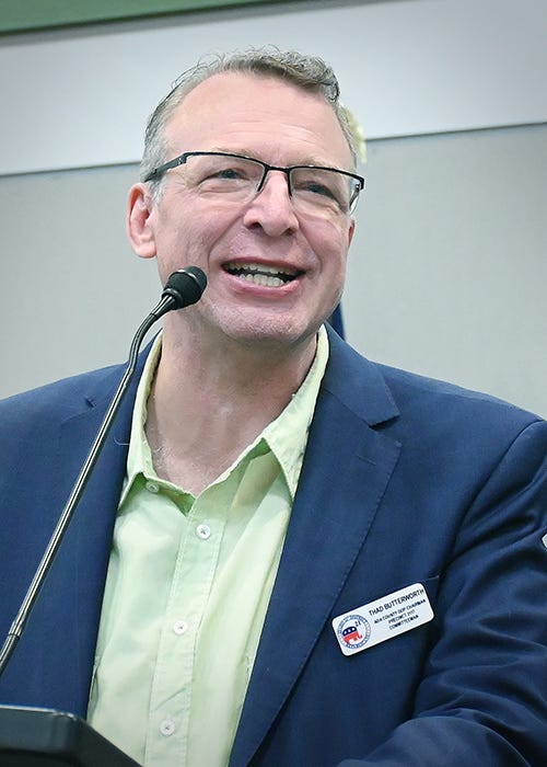 The first election was for the position of chairman. Thad Butterworth stepped up last fall after the resignations and was standing for election to a full term. Opposing him was businesswoman Debra Pitta. Both gave reasonably good speeches about Republican unity, and after a long vote count, Butterworth was reelected on a 106-73 vote.