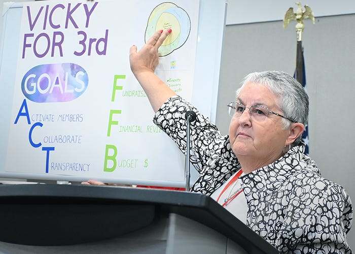 At this point it was clear how the rest of the night was going to go. Conservative votes were holding steady, while the Idaho Strong PCs were beginning to feel demoralized. Vicky McIntyre was elected 3rd vice chair 103-72 over Teresa Haldorson, Colette Costello was reelected secretary 105-66 over Tara Pugmire, and Sam Boyd won election as treasurer in absentia 96-69 over Brian Garrett.