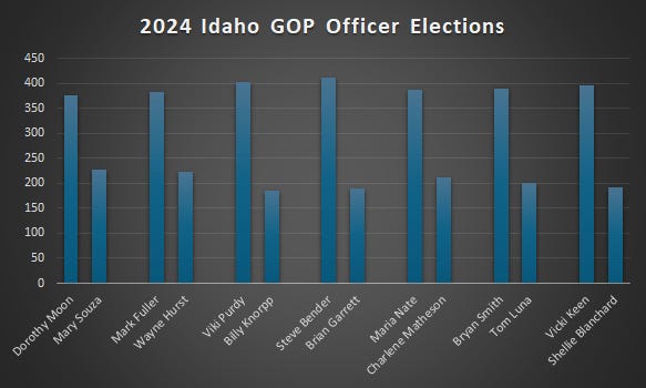 Dorothy Moon won election in Twin Falls over Tom Luna 434-287, giving her a margin of 147 and a share of 60.2%. Today in Coeur d’Alene, she defeated Mary Souza 376-228, giving her a margin of 148 and a share of 62.3%.