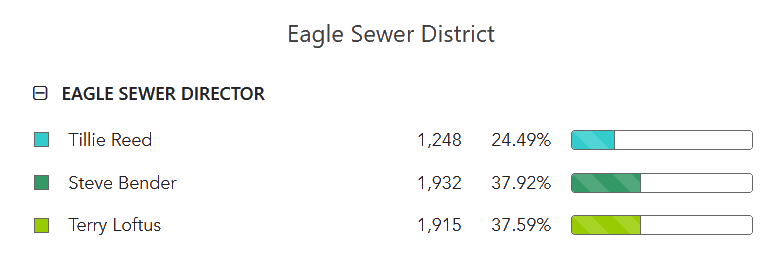 One more bit of good news: My friend Steve Bender won election to the Eagle Sewer District Board despite not campaigning. The top two vote-getters in this race will serve on the sewer district board, which isn’t the most prestigious position, but it is nevertheless important. Democrats use boards like this as their farm team, building a bench of experienced candidates for higher offices, so denying them that is a definite win. It’s also good to have a solid budget guy on one of our taxing boards.