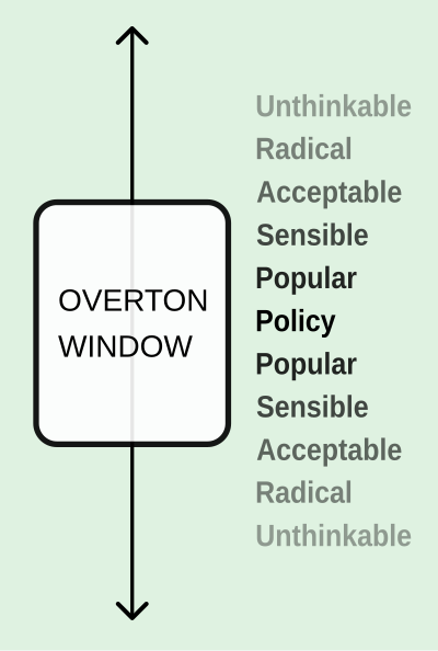 Factions that should be working together instead fight over who gets to set the tone. There’s a concept called the Overton Window, developed by political theorist Joseph Overton in the 1990s. It describes the range of ideas considered acceptable in public discourse at any given time.