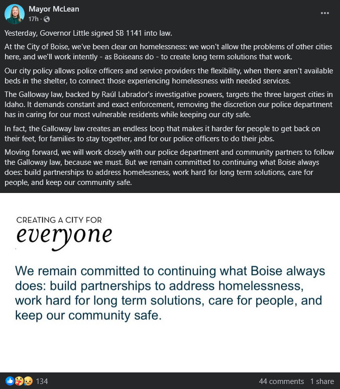 Mayor Lauren McLean of Boise denounced S1141 on Facebook yesterday: