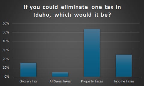 When asked which tax should be eliminated in Idaho, assuming you could pick only one, an outright majority — 54% — chose property taxes. Income taxes came in second with 25% and the grocery tax came in third at 16%.