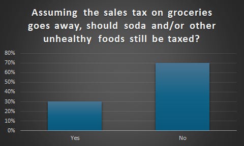 70% of respondents said that soda and/or other unhealthy foods should be treated the same as all groceries, if the tax is to be eliminated. I believe this reflects a desire among conservatives to not allow the government to micromanage our food choices by only exempting some foods from the sales tax, as Washington does.
