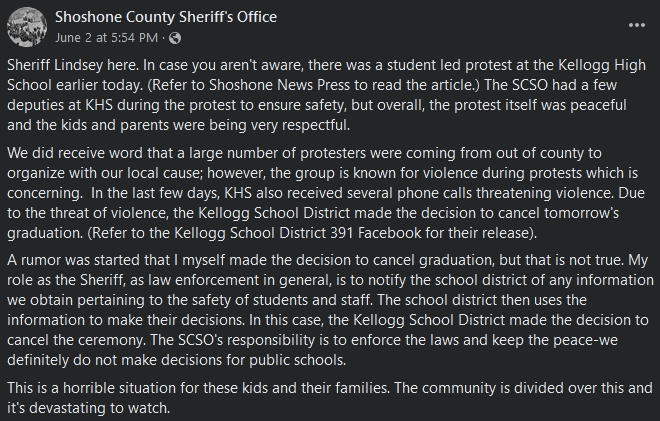 That last bit is interesting, because when the school announced they were postponing graduation, they cited a report from the sheriff’s office warning of “threats” from unspecified right wing provocateurs. The sheriff’s office later posted on Facebook that they did not cancel graduation, rather they claimed that “protesters from out of county” that were “known for violence” were coming to disrupt the ceremony. They offered nothing to back up this claim.