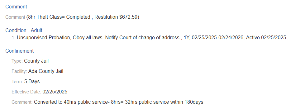 Today, Moore pled guilty to petit theft and was given a sentence of 5 days in jail, converted to 40 hours of community service, with judgment withheld. As I understand it, that means the conviction will not be put on her record unless she commits another crime in the future.