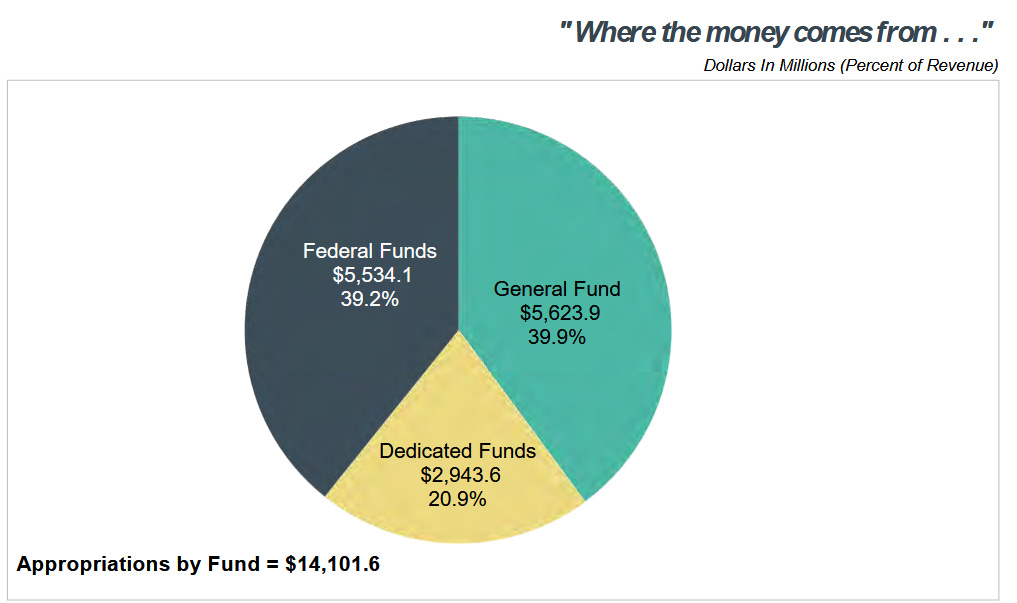 However, recall that the general fund is just one of three major sources of government spending. The Legislative Budget Book includes a pie chart showing the proportion of general funds compared with dedicated funds and federal money.