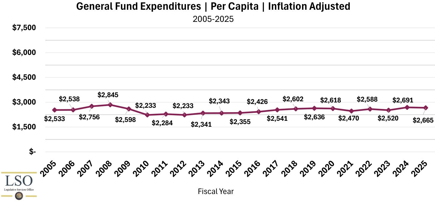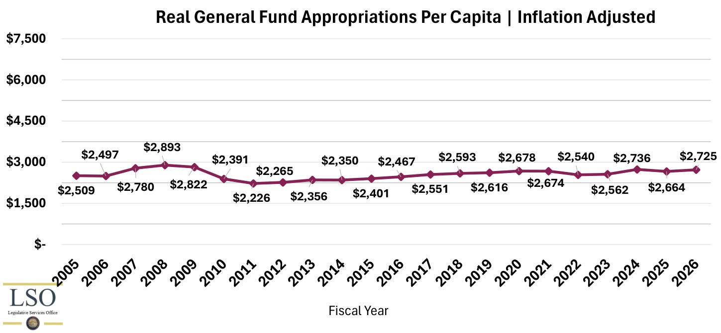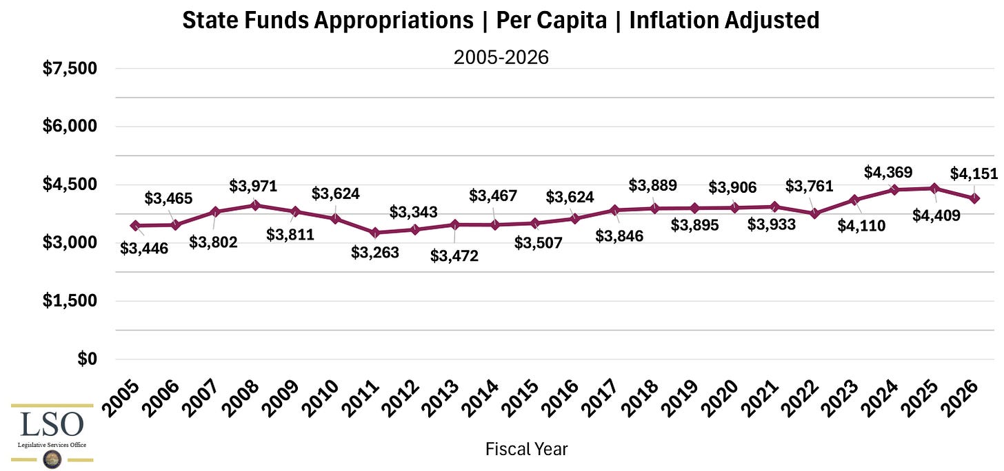 Consider these graphs from the same LSO document showing appropriations and expenditures from both the general and dedicated funds, adjusted for inflation and population growth.
