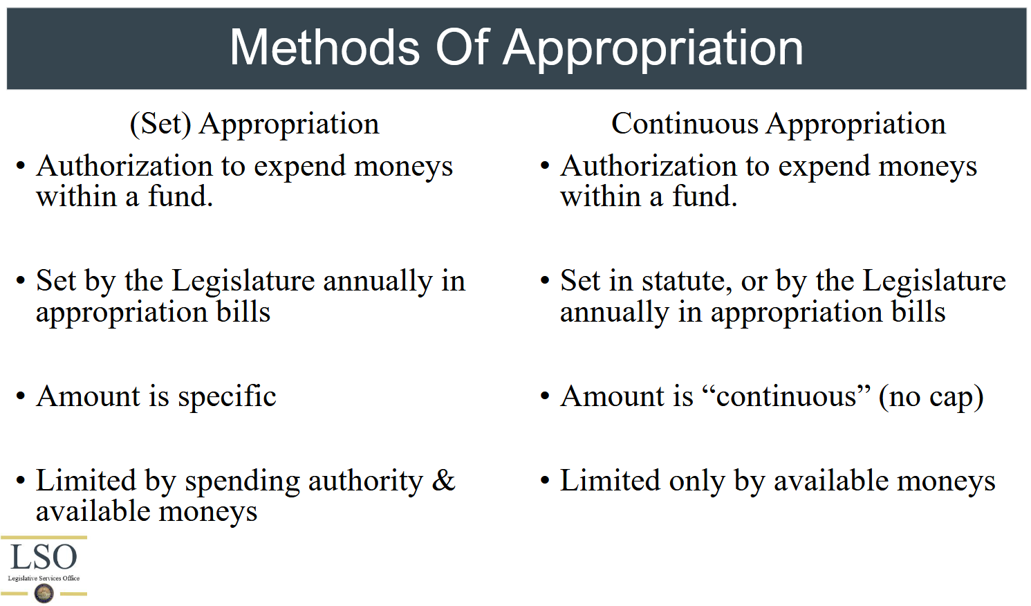 The presentation also listed several notable continuous appropriations:
