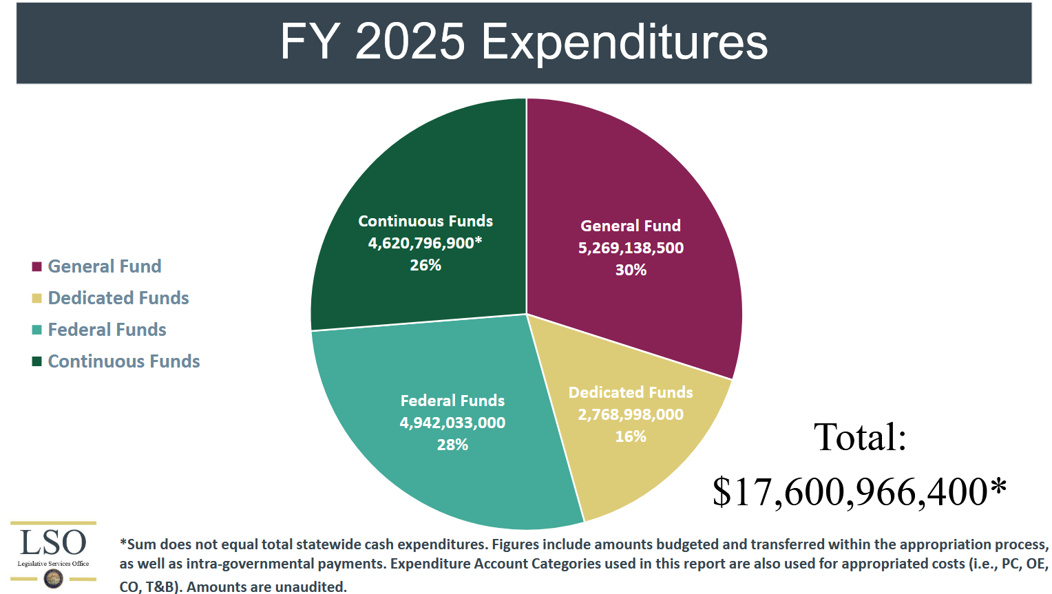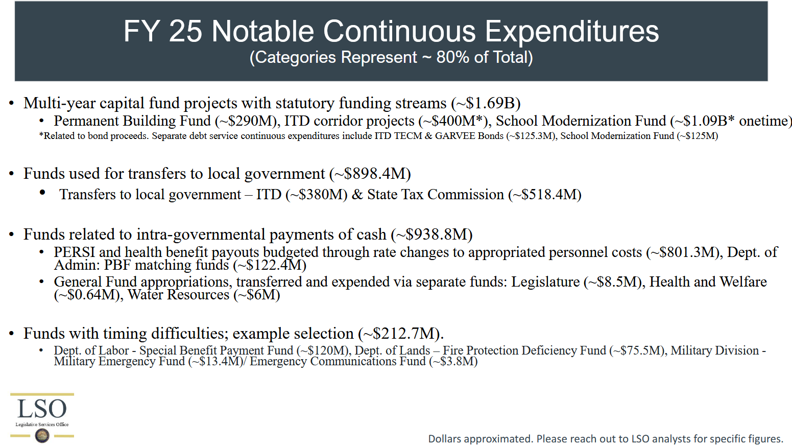 According to an LSO report presented to JFAC last fall, total continuous appropriations amounted to more than $4.6 billion. The presentation went into further detail about how continuous appropriations work: