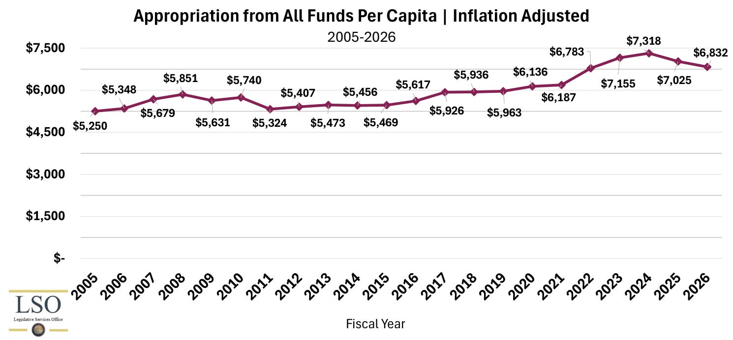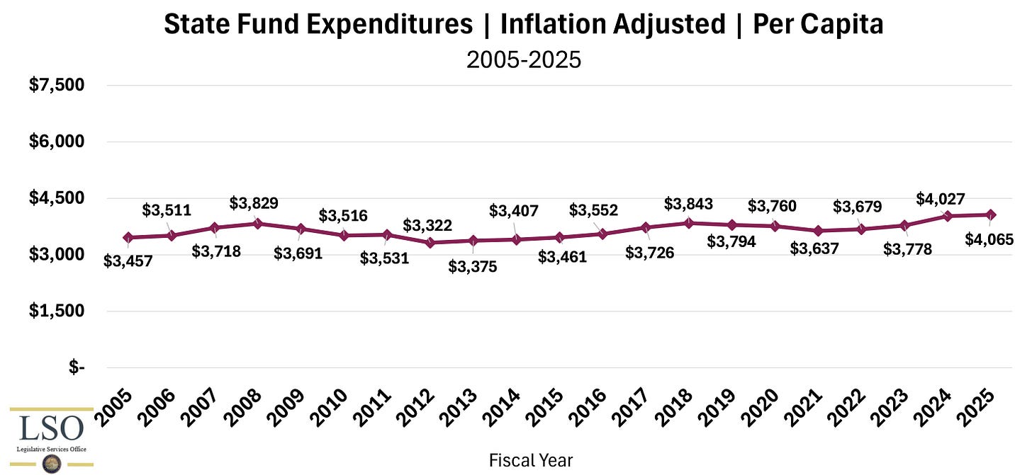 Prior to this session, LSO prepared a per capita report for JFAC presenting various spending metrics that account for both inflation and population growth. You can see the graph that Democrats disseminated near the top, showing both appropriations (money budgeted by JFAC and the Legislature) and expenditures (the actual money spent):