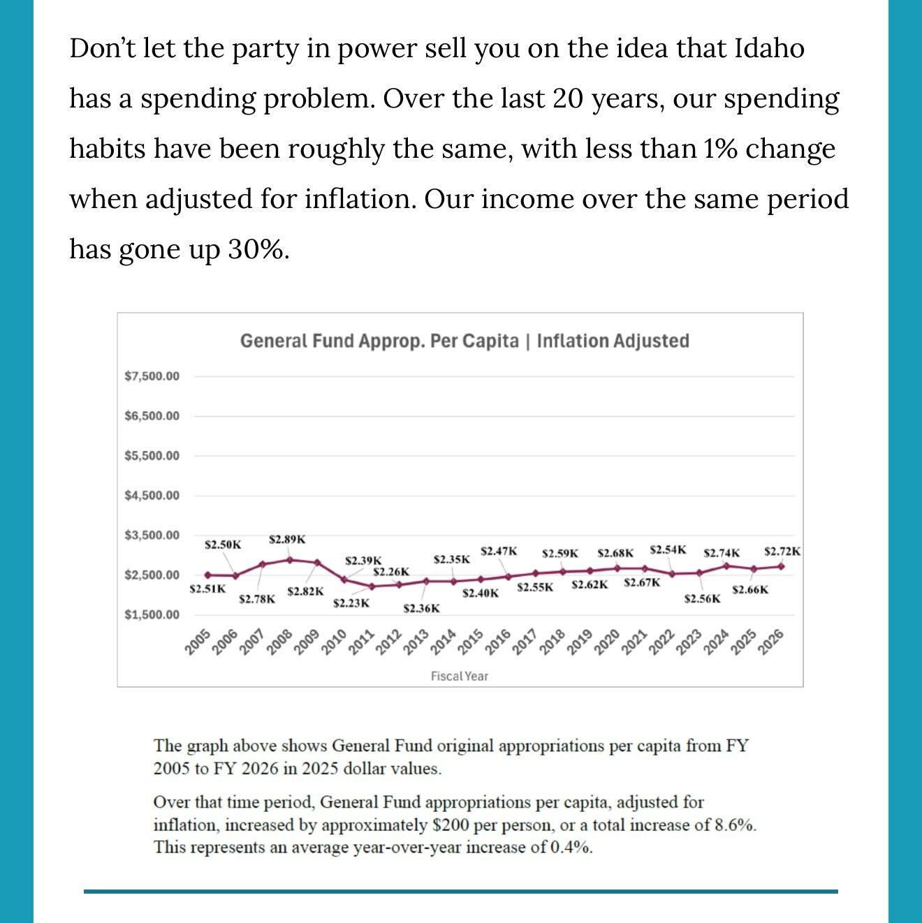 Prior to last month’s town hall in Emmett, local Democrats circulated a call for attendance along with a sheet of talking points and suggested questions. One of their talking points claimed that state spending, when adjusted for inflation and population growth, was essentially flat. This was intended to counter conservative claims that spending has significantly increased over the past five to ten years.