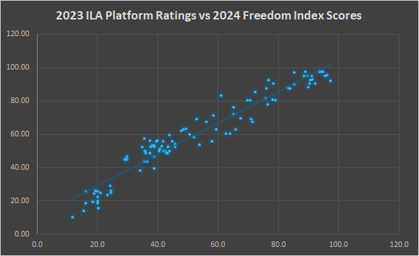 In fact, I plotted the 2023 platform ratings against the 2024 Freedom Index ratings and the results were striking. Even though these came from two different sessions, even though the Freedom Index measures several hundred bills while the ILA selected a few dozen, and even though they use different standards, they correlate incredibly well. It turns out a conservative is a conservative, a moderate a moderate, and a progressive a progressive no matter what metrics you use.