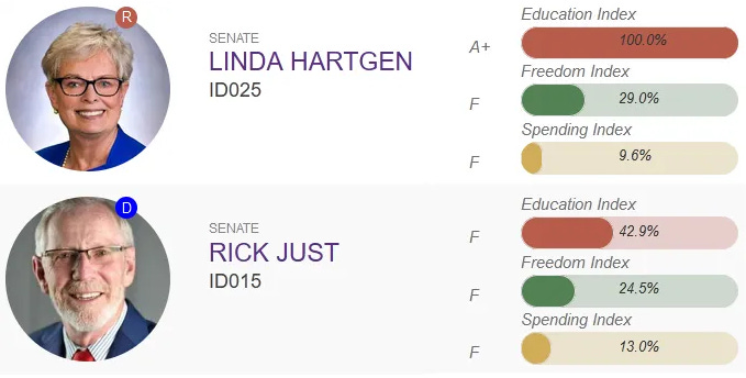 No Democrat scored higher on the Freedom Index this year than any Republican, which is to be expected. Sen. Linda Hartgen was the lowest scoring Republican at 29% while Sen. Rick Just was the highest scoring Democrat at 24.5%. Hartgen therefore appears to be much more aligned with progressive principles than conservative ones.