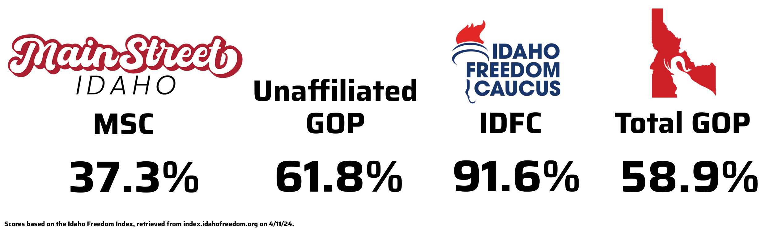 There were two distinct caucuses within the Republican Party this year. Conservative legislators organized the Idaho Freedom Caucus (IDFC), while moderate Republicans organized the Main Street Caucus (MSC). Public members of the IDFC averaged a score of 91.6% on the Freedom Index, while public members of the MSC averaged merely 37.3%. Republicans who do not publicly affiliate with either caucus scored an average of 61.8%.