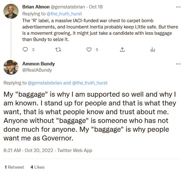 I still haven't decided who I will vote for; I find most of Bundy's positions difficult to disagree on, and his anti-feds past is certainly not a hinderance to me, but like others, I find something oddly disingenuous about him and I can't put my finger on it. McGeachin was as radical as he was on many issues, and she whole heartedly got my primary vote.
