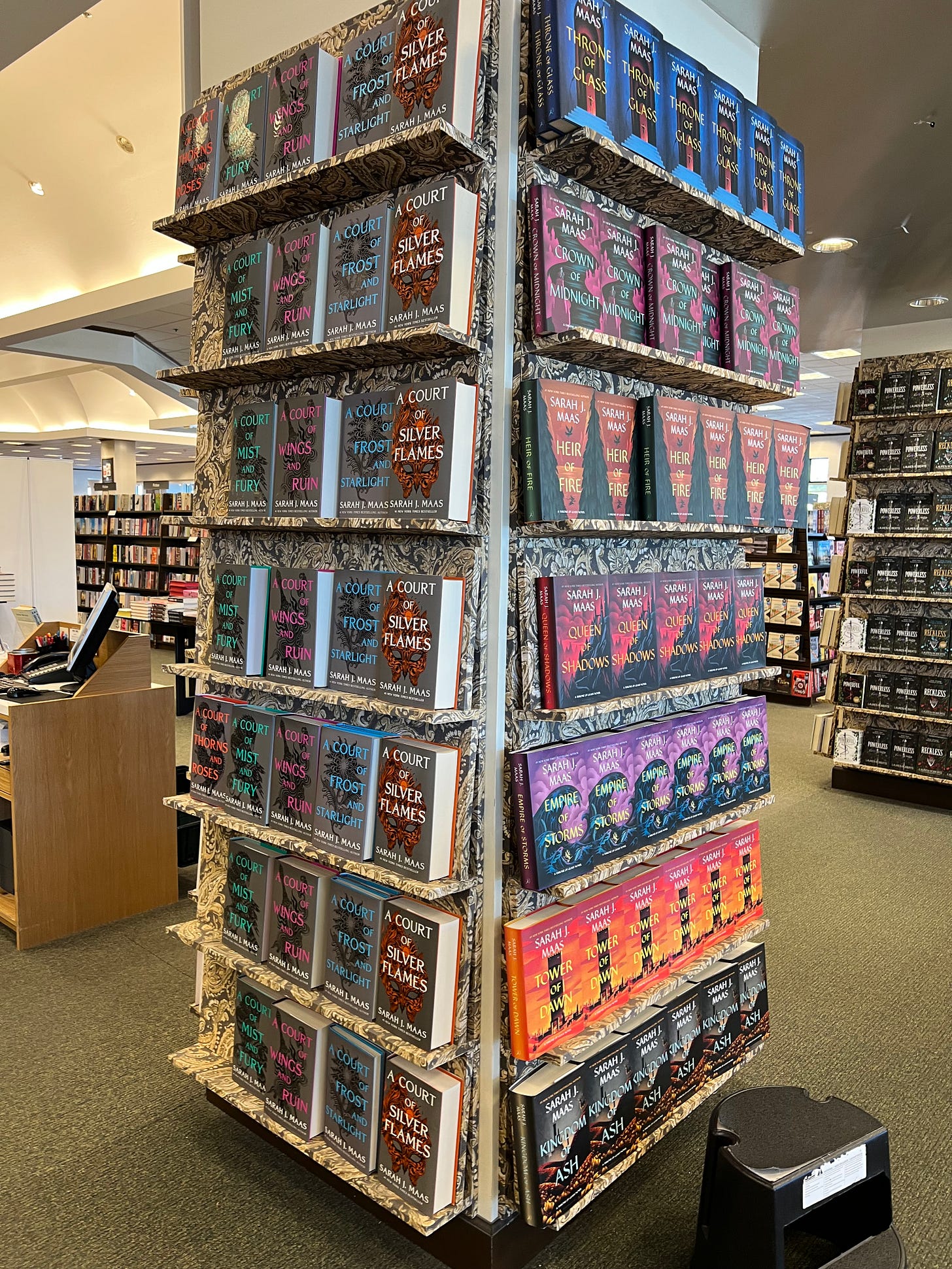 I went to a Barnes and Noble in Boise this afternoon to see where some of these books were placed. The young adult section was filled with teen romance, often with LGBTQ+ themes, while the young adult sci-fi/fantasy section was full of the sort of romance novels that have a veneer of fantasy, such as the Twilight series. I couldn’t find any of the books by Sarah Maas until I turned around and found an entire pillar devoted to them: