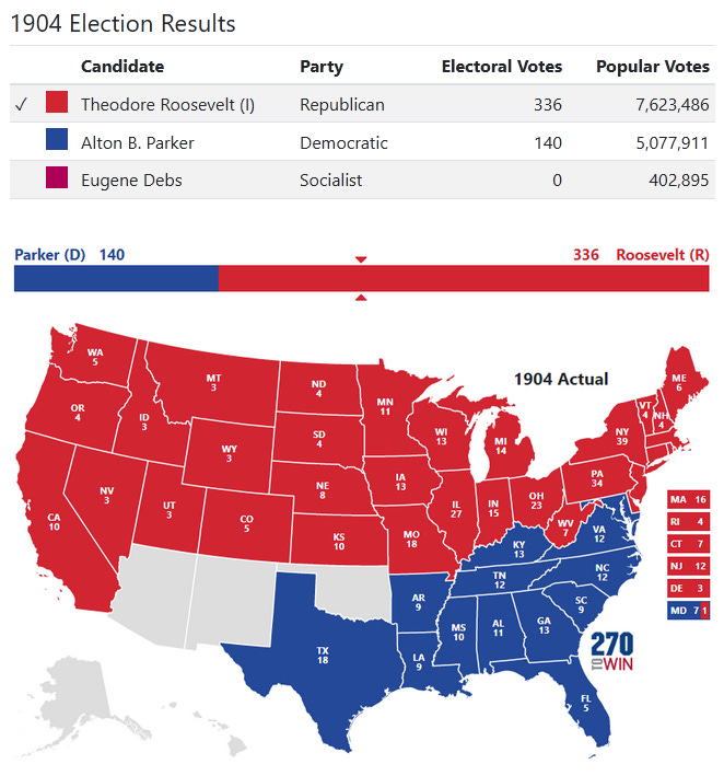 William Jennings Bryan’s takeover of the Democratic Party leading into the 1896 election brought many of these positions into the mainstream. Idaho continued its populist streak, supporting Bryan in 1896 and 1900. However, Republican Theodore Roosevelt championed some of these ideas when he became president following William McKinley’s assassination in 1901, and Idaho followed, supporting Roosevelt in 1904.