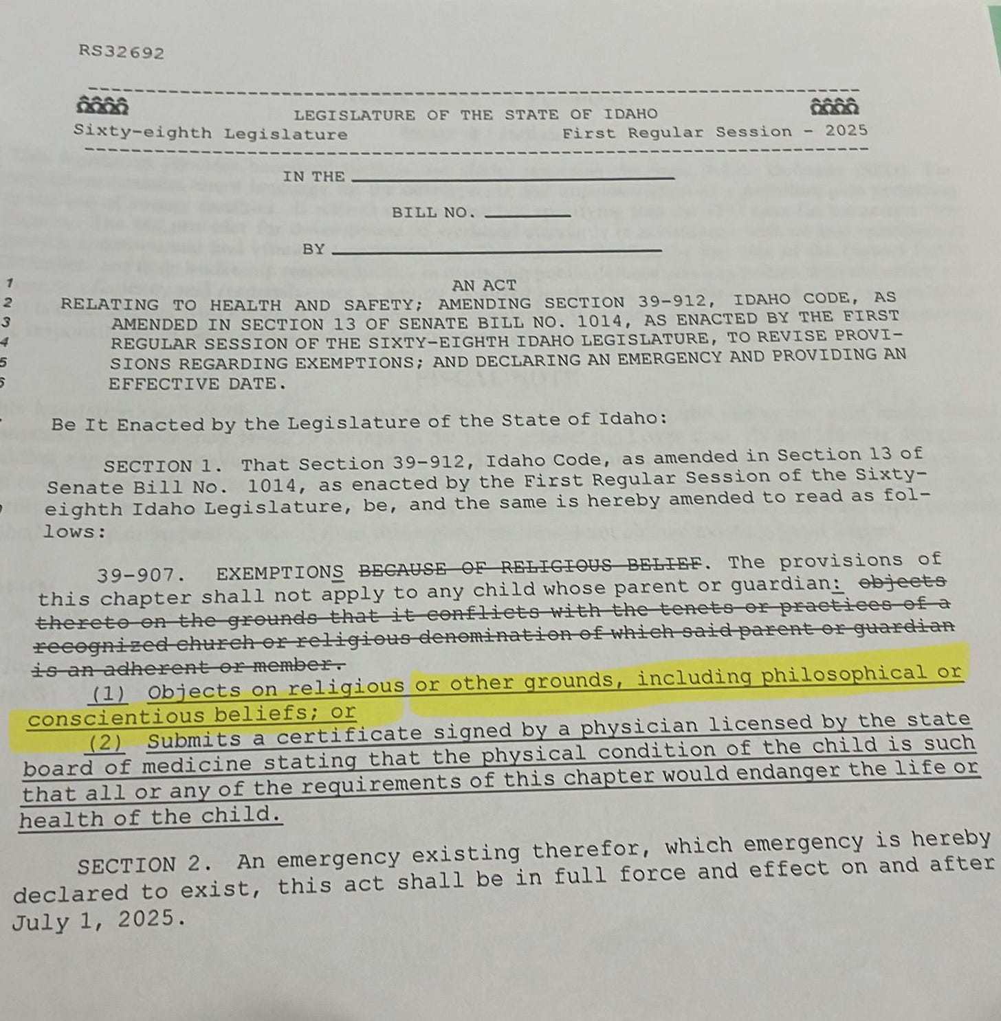As with H290, S1014 did not make any changes to the status quo. The same rules which were in effect before remain in effect afterward, and the same exemptions that were in effect remain as well. Idaho Code 32-1015, passed last year, maintains that all Idaho parents have the right to decide what medical care their children receive, and that includes opting out of eye goop and blood tests.