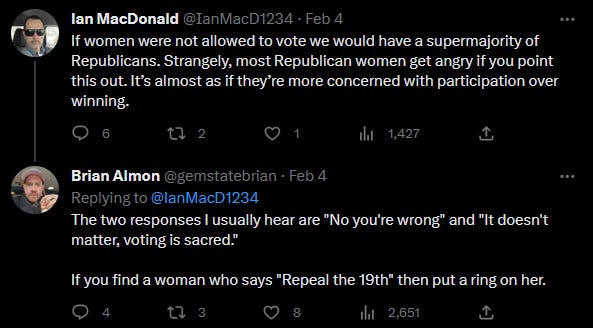 As you can see, the leftist trolls got some mileage out of it - nearly twice as many views as the original tweet. Just in case anyone is wondering, I will state for the record that I do not support repealing the 19th Amendment and removing the ability of women (that is, adult human females) to vote. Note that I didn’t even say that in the tweet, rather I simply recognized the fact that any woman who would defy the hive mind and say such a thing is certainly worth attention!