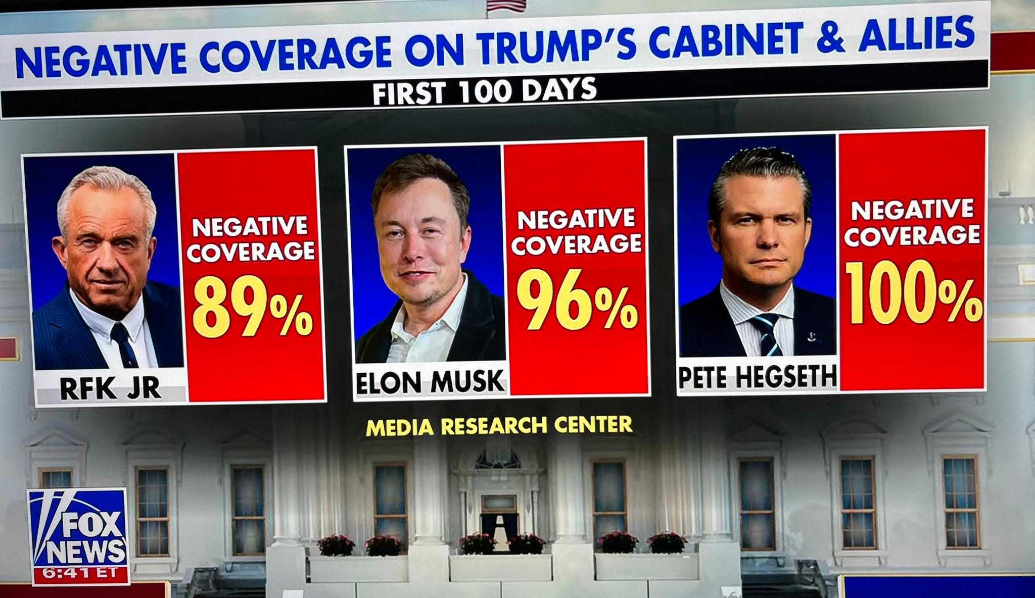 I recently saw a graphic on Fox News showing how corporate media (Fox excepted, presumably) have covered President Trump’s first 100 days.