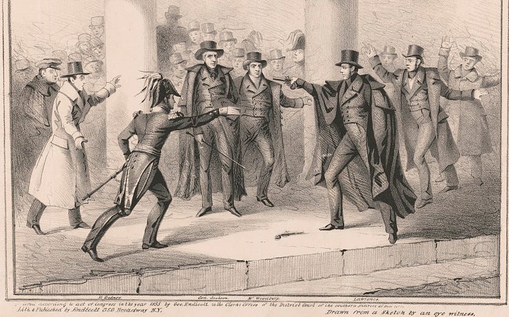 Early American politicians were not surrounded by layers of security like they are today. Andrew Jackson’s inaugural party was open to the public, which scandalized many at the time. Jackson himself faced death when a would-be assassin attempted to shoot him on the Capitol steps. Both his pistols misfired and Jackson beat the man with his can until Congressman Davy Crockett pulled him away.