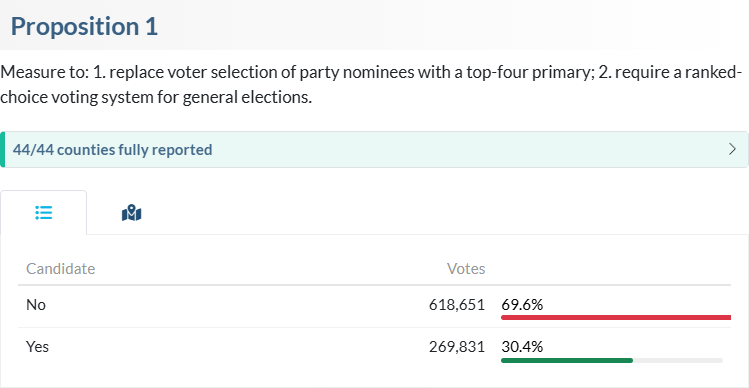 Yet the first results on Tuesday night showed Prop 1 losing bigly, and it was never close. 69.6% of voters rejected the jungle primary and ranked choice voting, defeating the measure by more than a 2:1 ratio: