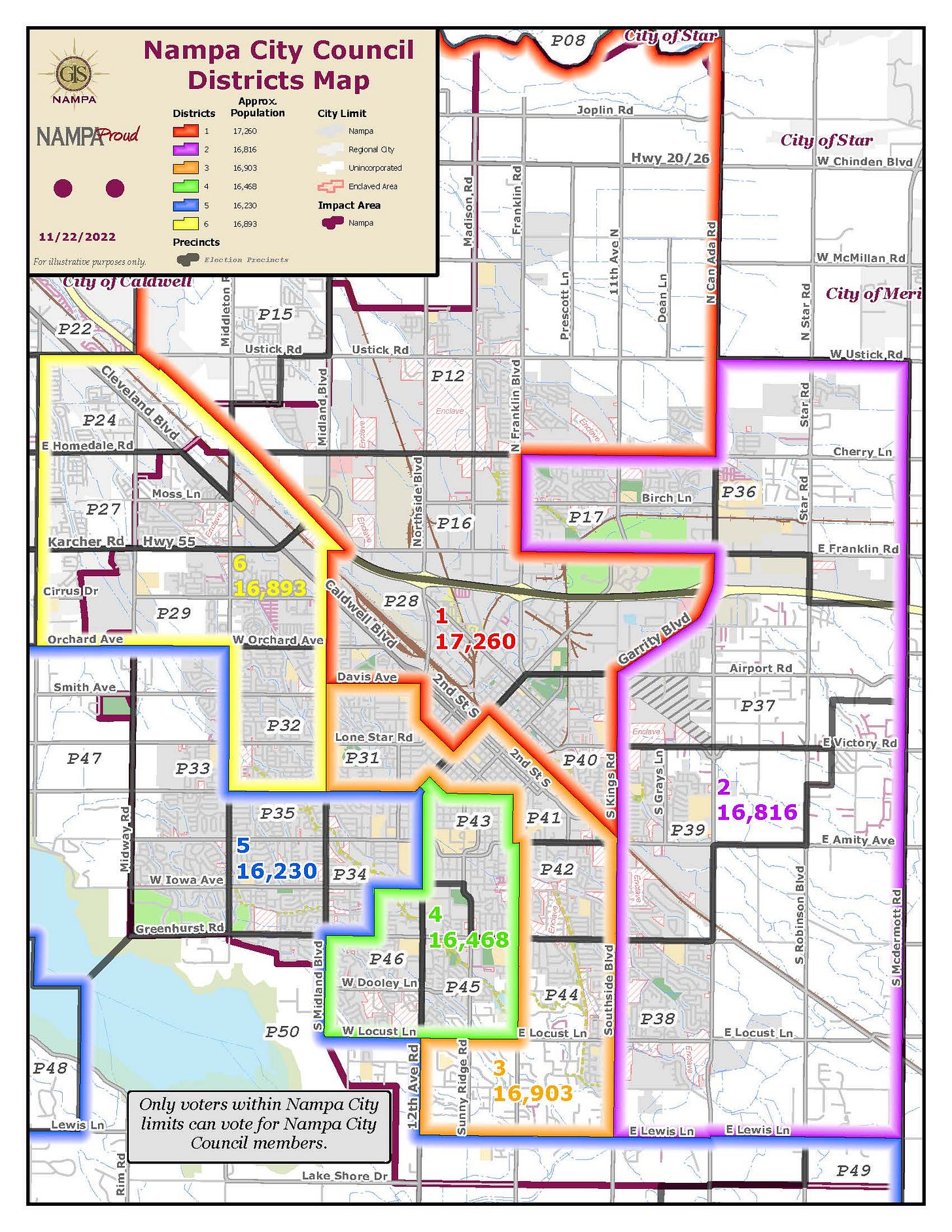 Nampa’s population grew steadily throughout the 20th century, passing 100,000 in 2020. That same year, the Legislature required any city with more than 100,000 residents to divide its council into districts, which Nampa accomplished prior to the 2023 elections. Council Districts 1, 3, and 5 are on the ballot this year, along with the mayor’s office.