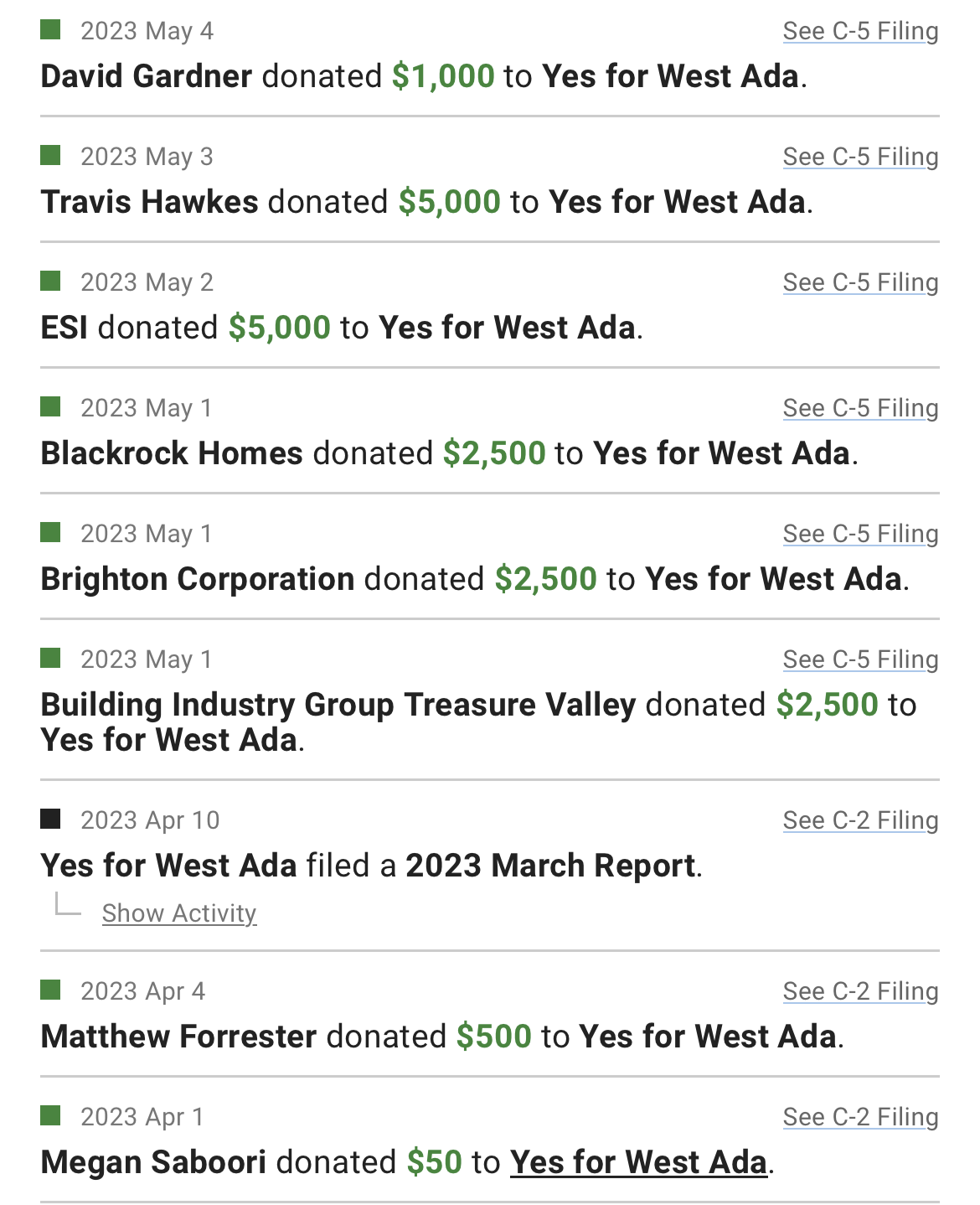 In case you’re wondering, this new PAC, "Yes For West Ada," was established in March by Megan Saboori, with Ashley Aven serving as the treasurer. Aven previously worked on the campaign of State Superintendent Debbie Critchfield. The PAC has received significant funding from construction firms and developers.