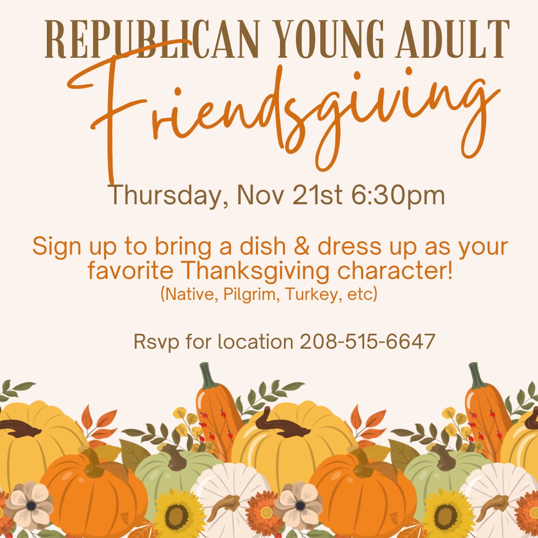 Are you a “young adult”? Young Republicans in the Treasure Valley are hosting a “friendsgiving” next week:
