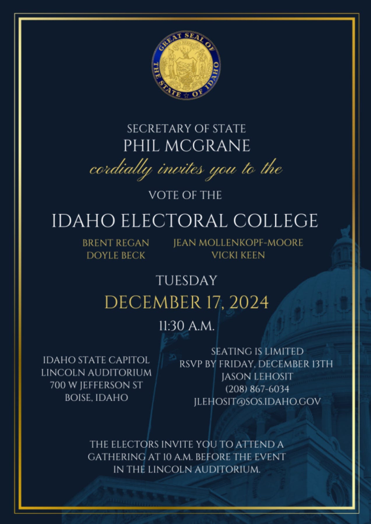 On Tuesday, December 17, 2024, Doyle Beck, Vicki Keen, Brent Regan, and Jean Mollenkopf-Moore will fulfill their duties as Idaho’s representatives in the Electoral College by casting their votes for Donald J. Trump. Secretary of State Phil McGrane invites you to come join the festivities in the Lincoln Auditorium.