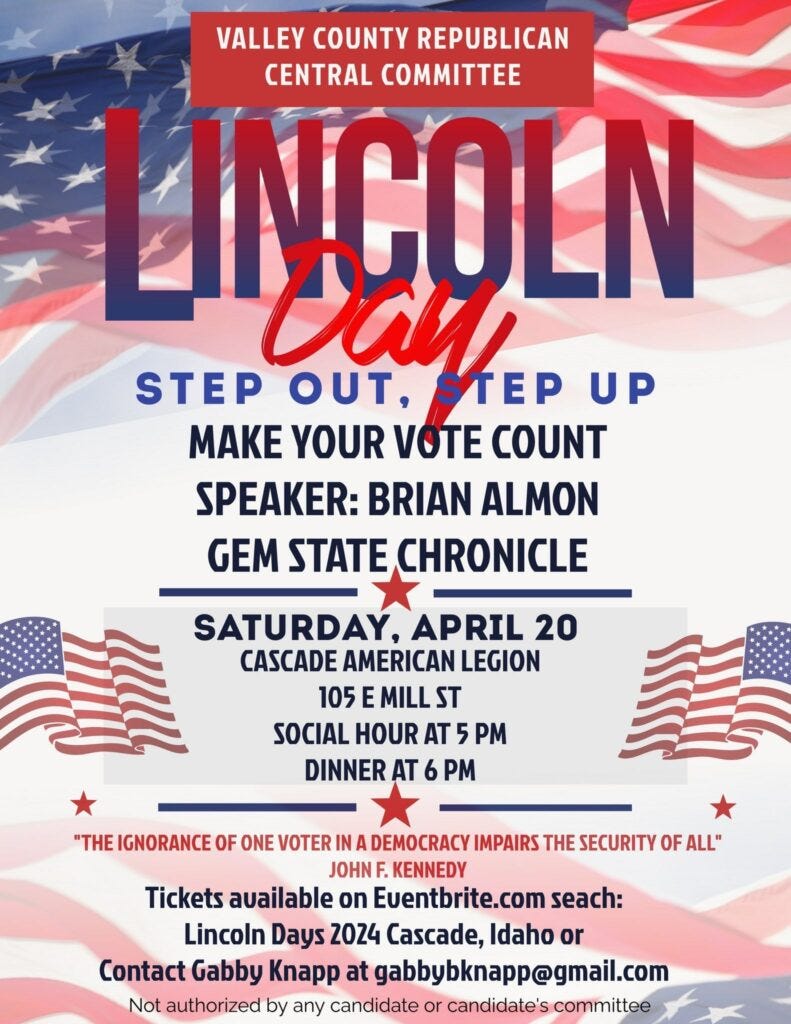 Join me next Saturday evening in beautiful Cascade, Idaho for the Valley County Lincoln Day Dinner. I look forward to visiting and meeting a great group of Republicans.