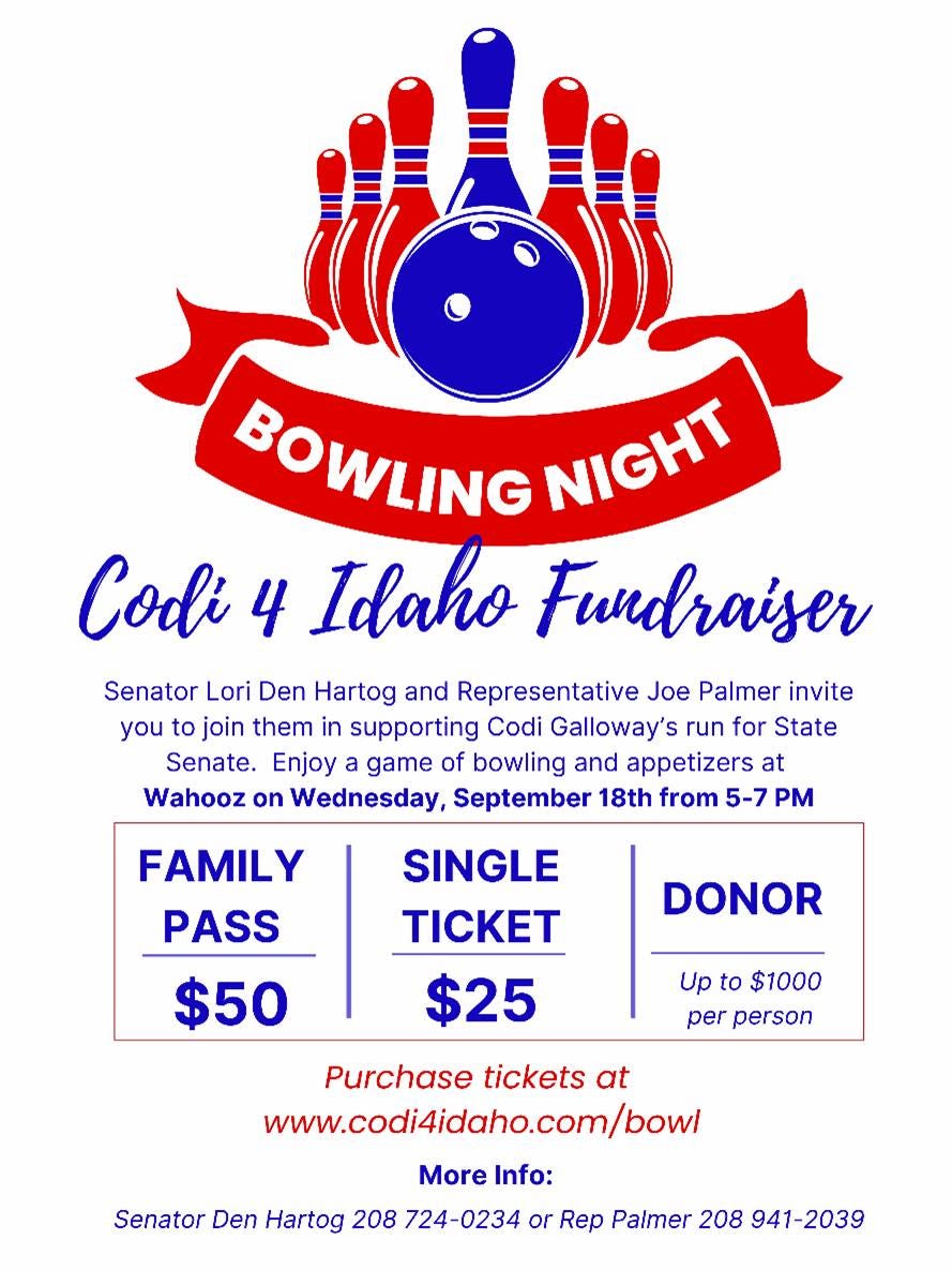 If you can’t make it to BSU that night, Sen. Lori Den Hartog and Rep. Joe Palmer are hosting a fundraiser for Codi Galloway’s campaign for Senate in district 15. Bring your family for a game of bowling at Wahooz and help regain lost ground in Boise!