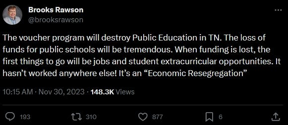 When public school defenders say they want to “save our schools” are they really trying to say that the public education system delivers the absolute best experience for all students, or are they really worried about the jobs it provides for teachers, administrators, and staff? A few weeks ago I came across a tweet from a public school administrator in Tennessee warning about the effect of a proposed school choice program: