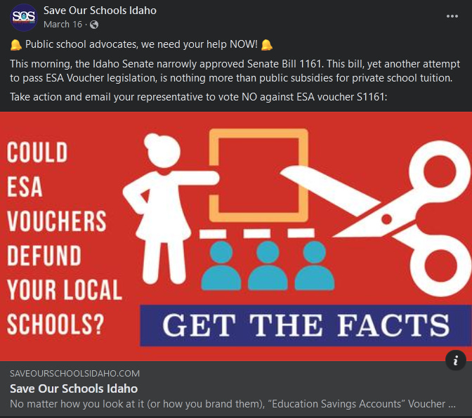 Around the same time they created a website, Facebook page, and Twitter account. Their website content is full of content against education savings accounts (ESAs), presumably because they knew that conservative senators were preparing to unveil Senate Bill 1038 which would have created ESAs for families to use at the schools of their choice. Save Our Schools deliberately conflated ESAs with vouchers, perhaps because they have found the latter word to sound scarier to voters. Senate Democrats did the same thing during debate over S1038.