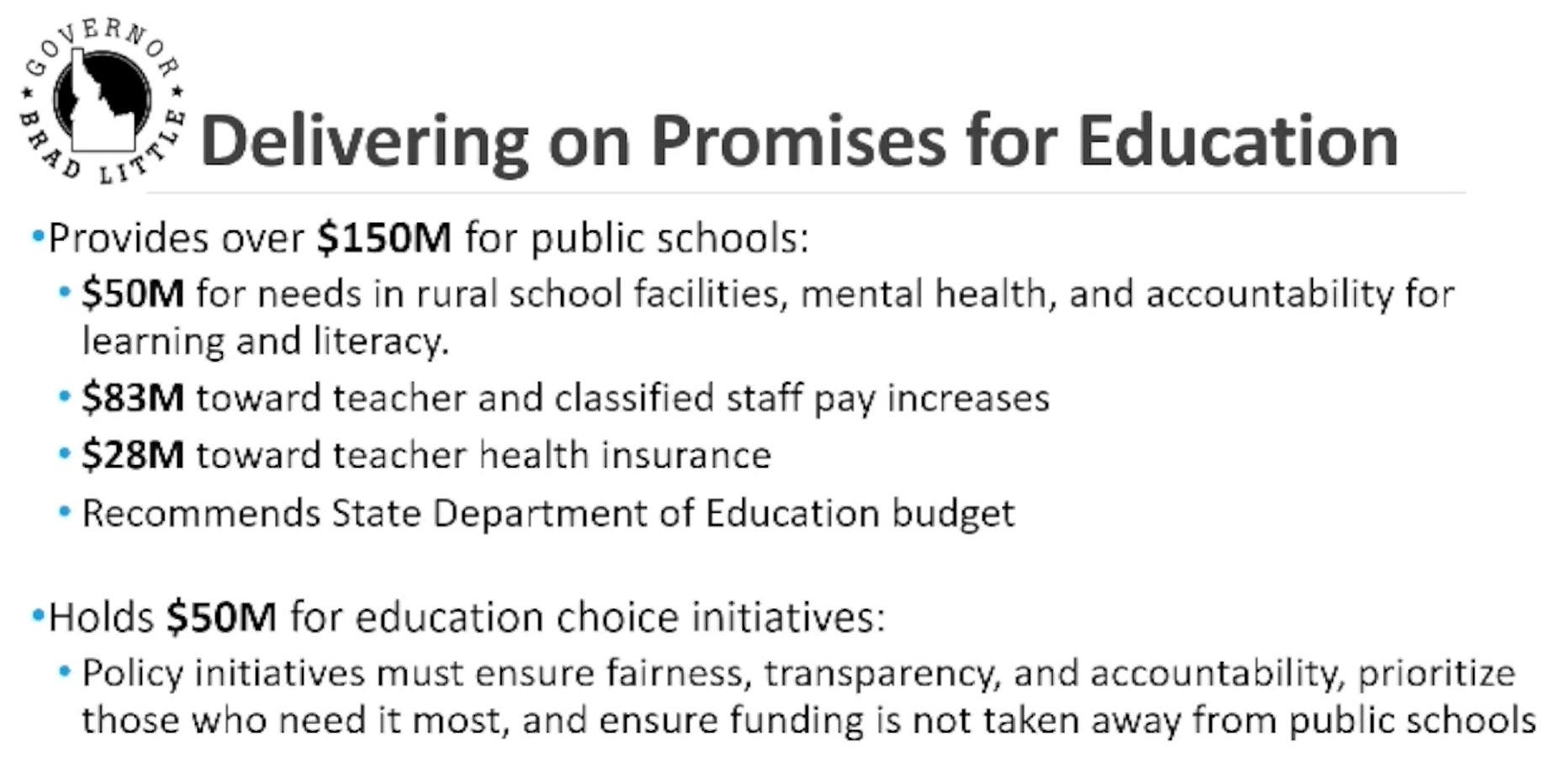 However, Gov. Brad Little said in his speech that he wants to see some measure of “accountability” for the students in these alternative programs. The governor’s budget presentation this morning in JFAC made it clear that he wants “sideboards” on the program: