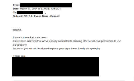 Knittel put his sign back up, but by Wednesday, March 27, they were once again removed. He called the facilities manager, who sent him an email informing him that his previous statement was incorrect, and that D.L. Evans Bank had given exclusive permission to other candidates to use the vacant lot: