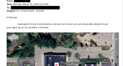 According to Knittel, he contacted the D.L. Evans Bank, which owned the vacant lot. A corporate facilities manager informed him that he did indeed have permission to place his signs on the lot: